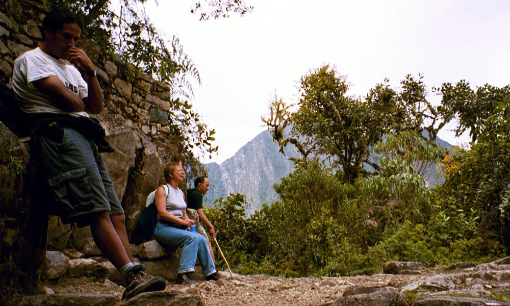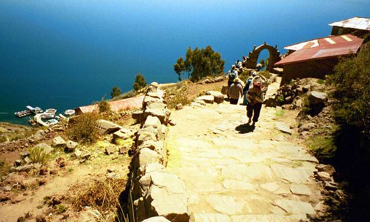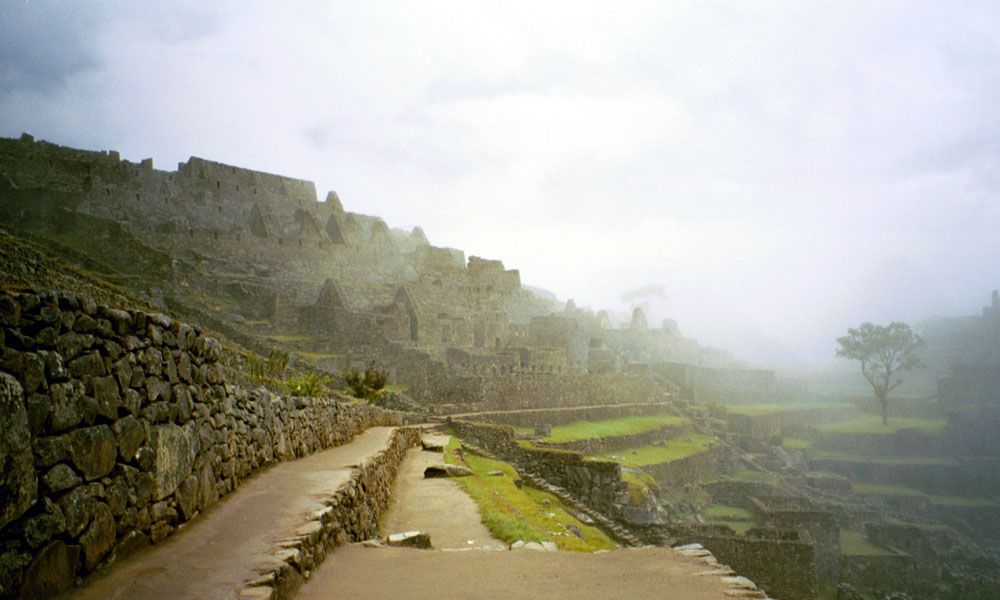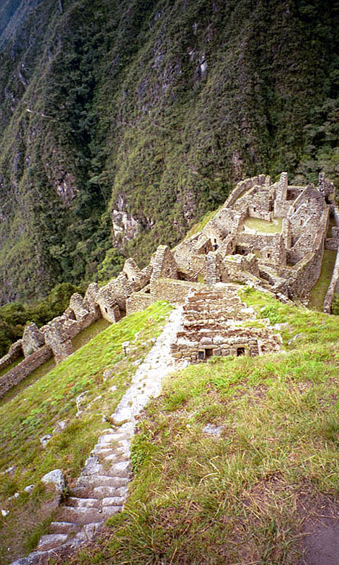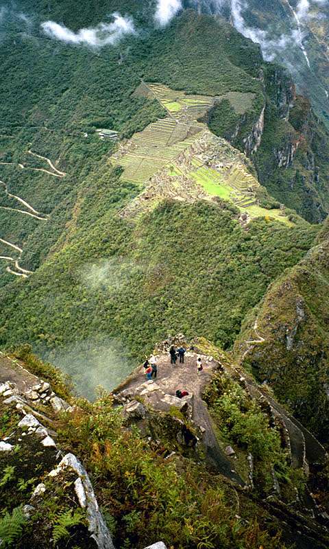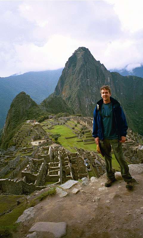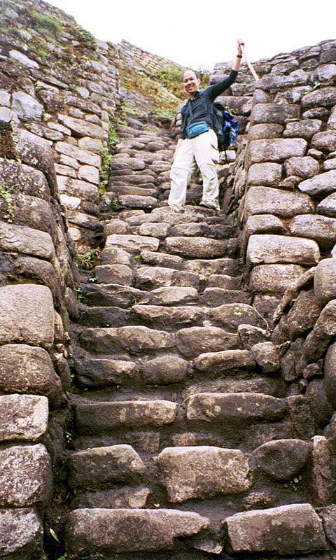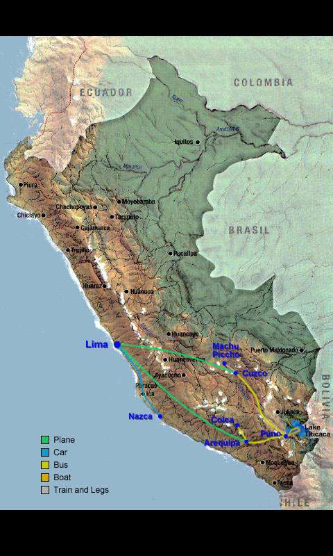 Handy map showing my routeKevin, realizing he was in the Lima airportNazca lines flight mapOur chariot of the godsThe CondorThe MonkeyThe Upsidedown MonkeyThe SpiderThe CrabThe Astronaut, waving a greetingCity of Cusco, the ancient Inca capitalCusco Plaza, home of direct salesInca/Spanish blending of costumes and mythThe weekly Cusco Sunday paradeSacsayhuaman fort above Cusco. Also known as "sexywoman" among tourists.A view of the fort walls. Cusco is laid out according to a puma plan, the fort serves as the head.Jumping off the train to start the Inca TrailStart of the Inca Trail (the two-day one anyway)One of the many stairs along the trail. Kev is feeling good now that he's got a walking stick.Taking a break on the trail. Our guide Rueben is on the left, our trailmate June is next to Kev.The Inca Trail proper, still walkable centuries laterThe waterfall just before Huinay Huayna (Forever Young) ruinsThe Huinay Huayna ruins after a long climbSome more ruins of something--oh, Machu PicchuI'm king of the ancient world!The royal observatory is the curved tower at center, the only building with non-rectangular wallsHut of the Caretaker of the Funerary RockStill-functioning Machu Picchu irrigation systemThe royal observatory. The various windows line up with sun sightings on the equinoxes.Machu Picchu at dawn, looking out into the valley beyondAll the walls in the sacred quarter were precisely fitted with no mortarThe royal observatory with Huayna Picchu beyondThe sacred quarter, free of tourists (almost)The main courtyard and sacred quarterA view from way on top of Huayna Picchu, looking down at Machu Picchu. Kev and friends are standing just below.Machu Picchu valley. Aguas Calientes is just around the bend in the river.Kevin went home after Machu Picchu, something about a wife and kids waiting for him. So I took a bus to Puno and headed out to the fabled floating islands of Lake Titicaca, two miles above sea levelOne of the floating islands. Natives have lived here for centuries, building 2m thick mats of reeds on which to live.A typical village with working boatsThe construction method for creating the islands--take a reed stump and start twisting reeds into it.A couple of boat prows. Note the use of soda bottle bottoms for the eyes.Boat landing for Isla Amantani where I will spend a night with a local familyAnd here's the local familyThere's no electricity on Amantani so when the sun goes down, it's real dark. But there's Coleman lanterns and beer so everyone gets dressed up and goes dancing. If the altitude doesn't get you, the dancing will.My roommates--Noemi from Spain and Megan from Melbourne, AustraliaGrethle, a native Lime a (from Lima that is) who graciously volunteers to show me around her city when I arrive there a week later.Isla Taquile locals hanging out in the plaza.Your basic hot shower. Note that if you forget to turn off the breaker after shutting off the water, the heating chamber will fry. Also note lack of instructions.Taquile square. Interesting to note that single and married people wear different hats, and the positions of the hats indicate whether they're having a good day or bad.A group of Taquile women, all apparently having a good dayThe Descent of 550 Steps to leave Taquile islandThe venerable SS Yavari, a ship that was hauled in pieces up the Andes to the lake back in the mid-1800s. Rescued from destruction, it is now being restored for future journeys.The Condor Mirador (watchtower) high above the city of Puno, overlooking Lake TiticacaA view on the way from Puno to ArequipaThe beautiful plaza of ArequipaInside the infamous convent of Santa Catalina in ArequipaThe wash tubs where centuries of nuns scrubbed, Santa Catalina conventThe mighty Colca Canyon, deepest in the world and scenic to bootA village church in the canyonThe canyon from outside the village. We started waaay at the top, about at the center of the photo.Dinnertime at my host's house--alpaca steaks. I stayed one night here after climbing down the canyon.No cuy (guinea pig) was served that night, so they felt safe to scurry around the floor and look cute. And yes, they taste like chicken.The night's accommodationsA memorial to one of the last Inca-Spanish battles that took place deep in the ColcaAh, the Oasis at the bottom of the canyon. We're heading for the hut with the pool.The Cruz de Condor on the rim of Colca CanyonThe great tourist mart for those waiting to see the condorsYep, a condor. He's got a nine-foot wingspan, but it's hard to tell here.Making another passOne coming in to land and sun himself. Note the scale with humans on the hill.Coming around for another look at the tourists, the Cruz de Condor in the foregroundFurther up the canyon. Note the terracing of the entire valley, the result of centuries worth of labor.The plaza of Chivay town, on the way from Colca back to ArequipaLima, Miraflores district, the view from my five-star hotel (what the hell, it was my last night in Peru)Plaza San Martin, the plaza at the heart of LimaChanging of the guard at the Lima capitol buildingLima's main cathedral, La Catedral right on the Plaza de ArmasPlaza de Armas in central LimaOne of the many central Lima churchesGrethle outside of the church of San FranciscoThe catacombs of San Francisco--the bones in the foreground are piles 4m deepThe very decorative Well of Souls in the San Francisco catacombsThe Lima National MuseumCusco royal burial chamber, reconstitutedA typical Miraflores church on the plazaThe last evening in Peru, walking back along the Miraflores shoreline